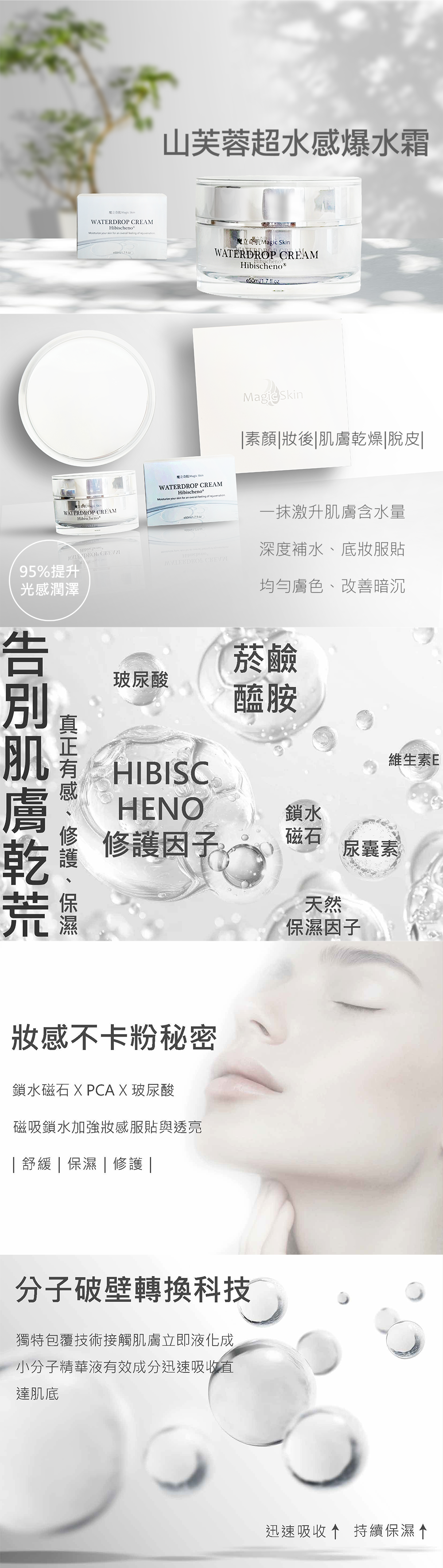 Hibischeno®修護因子、維生素E、玻尿酸、海藻糖、菸鹼醯胺、尿囊素、天然保濕因子、鎖水磁石